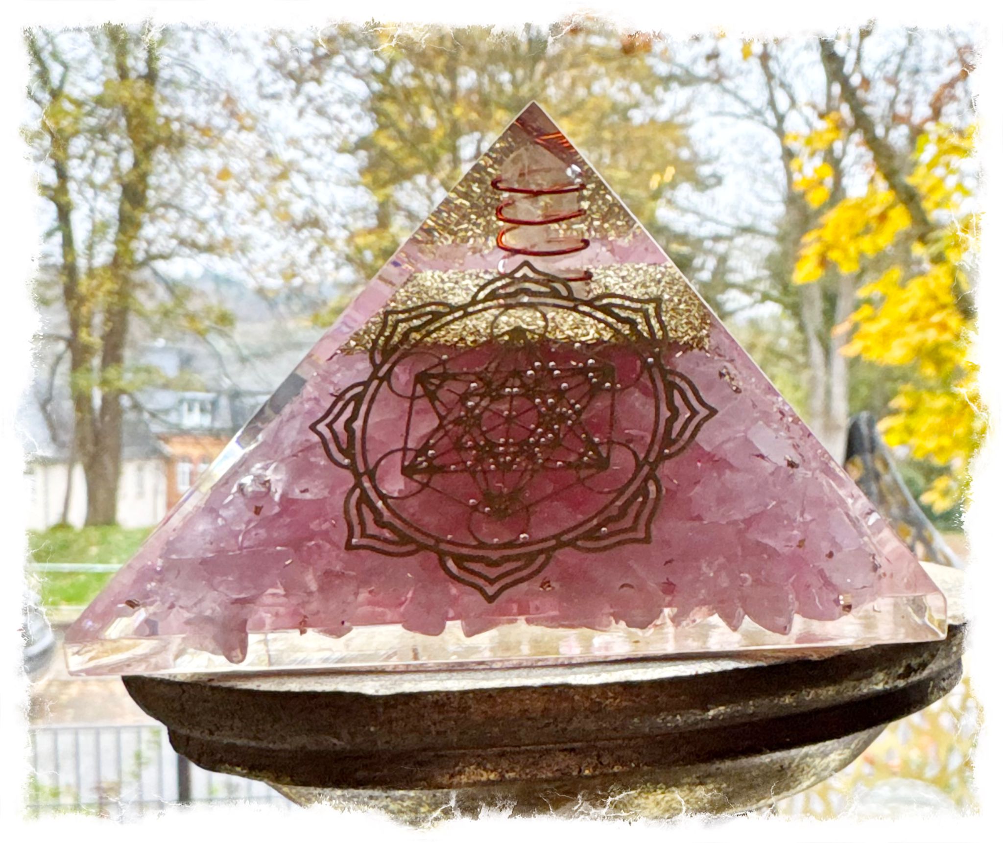 Die Pyramide wirkt wie ein Transformator, der schlechte Energie in gute Energie transformiert. Z.B. Erdstrahlen, Wasseradern, Plätze mit Traumata, während der Energie Arbeit, neben dem Bett. Überall, wo man die Energie anheben und transformieren möchte! Bitte mit den Seiten exakt nach den Himmelsrichtungen ausrichten. Die Pyramiden wurden von mir alle speziell informiert und energetisiert und haben mindestens 600.000 Bovis!