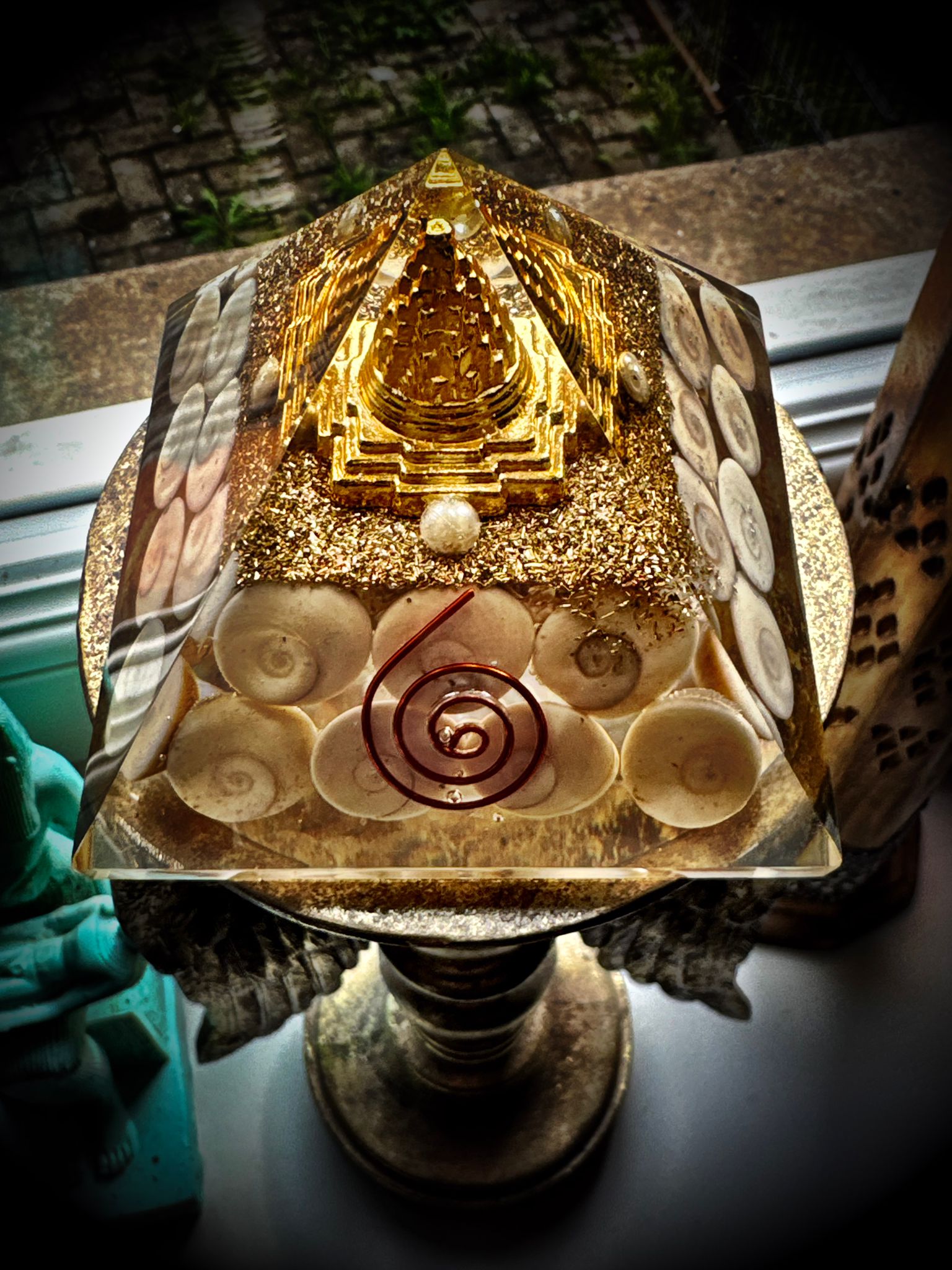Diese Orgonit Energiepyramiden haben eine Seitenlänge von 8 cm mit Muscheln, kleinen Perlen und goldenem Shri Yantra Tempel als Spitze. Unsere Orgonit Pyramiden schwingen alle auf 600.000 Bovis, durch unsere spezielle Programmierung. Man kann mit ihnen ein energetisches Kraftfeld in jedem Raum aufbauen und die Wirkung unserer Neutralisatoren verstärken und unterstützen. Dieses Kraftfeld schützt vor jeglicher Art von negativer Fremd Energie, wie Elektrosmog, Geopathie und Wasseradern. Das Raumklima wird erheblich verbessert. Die Reflexionsenergie einer einzigen Orgonpyramide ist ausreichend für Räume bis zu 40 qm.